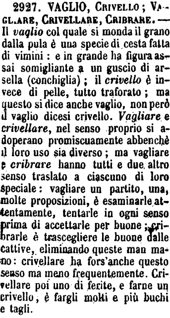 | Vaglio, Crivello; Vagliare, Crivellare, Cribrare - Il vaglio col quale si monda il grano dalla pula è una specie di cesta fatta di vimini: e in grande ha figura assai somigliante a un guscio di arsella (conchiglia); il crivello è invece di pelle, tutto traforato: ma questo si dice anche vaglio, non però il vaglio dicesi crivello. Vagliare e crivellare, nel senso proprio si adoperano promiscuamente abbenchè il loro uso sia diverso; ma vagliare e cribrare hanno tutti e due altro senso traslato a ciascuno di loro speciale: vagliare un partito, una, molte proposizioni, è esaminarle attentamente, tentarle in ogni senso prima di accettarle per buone; cribrarle è trascegliere le buone dalle cattive, eliminando queste man mano: crivellare ha fors'anche questo senso ma meno frequentemente. Crivellare poi uno di ferite, e farne un crivello, è fargli molti e più buchi e tagli. [immagine] |
