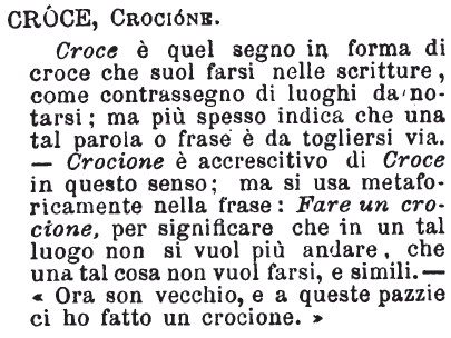 | Croce, Crocione - Croce è quel segno in forma di croce che suol farsi nelle scritture, come contrassegno di luoghi da notarsi; ma più spesso indica che una tal parola o frase è da togliersi via. - Crocione è accrescitivo di Croce in questo senso; ma si usa metaforicamente nella frase: Fare un crocione, per significare che in un tal luogo non si vuol più andare, che una tal cosa non vuol farsi, e simili. - « Ora son vecchio, e a queste pazzie ci ho fatto un crocione. » [immagine] |