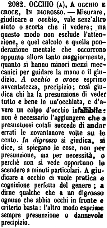 | Occhio (a), A occhio e croce, In digrosso - Misurare, giudicare a occhio, vale senz'altro aiuto o scorta che il vedere; ma questo modo non esclude l'attenzione, e quel calcolo e quella ponderazione mentale che occorrono appunto allora tanto maggiormente, quanto si hanno minori mezzi meccanici per guidare la mano o il giudizio. A occhio e croce esprime avventatezza, precipizio; così giudica chi ha la presunzione di veder tutto e bene in un'occhiata, e d'avere un colpo d'occhio infallibile: non è necessario l'aggiungere che a presuntuosi cotali succede di andar errati le novantanove volte su le cento. In digrosso si giudica, si dice, si spiegano le cose, non per presunzione, ma per necessità, o perchè non si vede opportuno lo scendere a minuti particolari. A giudicare a occhio ci vuole pratica e cognizione perfetta del genere; a dirne qualche che a un digrosso ognuno che abbia occhi in fronte e criterio basta: l'altro modo esprime sempre presunzione o dannevole precipizio. [immagine] |