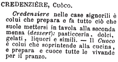 | Credenziere, Cuoco - Credenziere nelle case signorili è colui che prepara e fa tutto ciò che suole mettersi in tavola alla seconda mensa (dessert): pasticceria, dolci, gelati, liquori e simili. - Il Cuoco è colui che soprintende alla cucina, e prepara e cuoce tutte le vivande per il pranzo. [immagine] |
