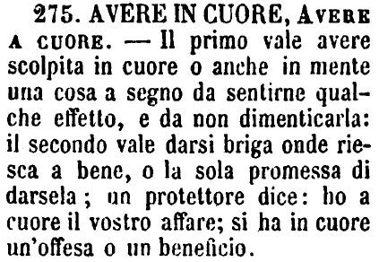 | Avere in cuore, Avere a cuore - Il primo vale avere scolpita in cuore o anche in mente una cosa a segno da sentirne qualche effetto, e da non dimenticarla: il secondo vale darsi briga onde riesca a bene, o la sola promessa di darsela; un protettore dice: ho a cuore il vostro affare; si ha in cuore un'offesa o un beneficio. [immagine] |