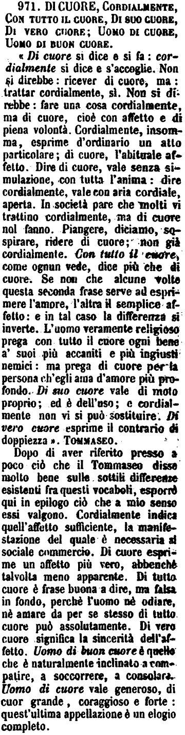 Di cuore, Cordialmente, Con tutto il cuore, Di suo cuore, Di vero cuore; Uomo di cuore, Uomo di buon cuore - «Di cuore si dice e si fa: cordialmente si dice e s'accoglie. Non si direbbe: ricever di cuore, ma: trattar cordialmente, sì. Non si direbbe: fare una cosa cordialmente, ma di cuore, cioè con affetto e di piena volontà. Cordialmente, insomma, esprime d'ordinario un atto particolare; di cuore, l'abituale affetto. Dire di cuore, vale senza simulazione, con tutta l'anima: dire cordialmente, vale con aria cordiale, aperta. In società pare che molti vi trattino cordialmente, ma di cuore nol fanno. Piangere, diciamo, sospirare, ridere di cuore; non già cordialmente. Con tutto il cuore, come ognun vede, dice più che di cuore. Se non che alcune volte questa seconda frase serve ad esprimere l'amore, l'altra il semplice affetto: e in tal caso la differenza si inverte. L'uomo veramente religioso prega con tutto il cuore ogni bene a' suoi più accaniti e più ingiusti nemici: ma prega di cuore per la persona ch'egli ama d'amore più profondo. Di suo cuore vale di moto proprio; ed è dell'uso; e cordialmente non vi si può sostituire. Di vero cuore esprime il contrario di doppiezza». Tommaseo.