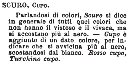 | Scuro, Cupo - Parlandosi di colori, Scuro si dice in generale di tutti quei colori che non hanno il vistoso e il vivace, ma si accostano più al nero. - Cupo è aggiunto di un dato colore, per indicare che si avvicina più al nero, scostandosi dal bianco. Rosso cupo, Turchino cupo. [immagine] |