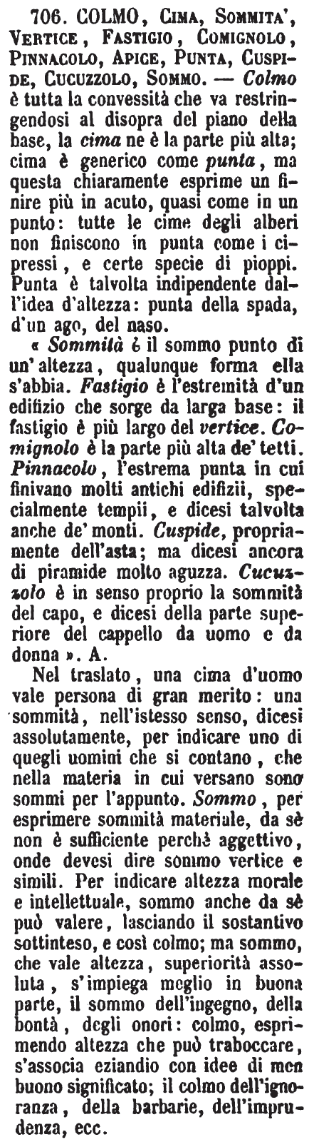 « Sommità è il sommo punto di un'altezza, qualunque forma ella s'abbia. Fastigio è l'estremità d'un edifizio che sorge da larga base: il fastigio è più largo del vertice. Comignolo è la parte più alta de' tetti. Pinnacolo, l'estrema punta in cui finivano molti antichi edifizii, specialmente tempii, e dicesi talvolta anche de' monti. Cuspide, propriamente dell'asta; ma dicesi ancora di piramide molto aguzza. Cucuzzolo è in senso proprio la sommità del capo, e dicesi della parte superiore del cappello da uomo e da donna ». A. Nel traslato, una cima d'uomo vale persona di gran merito: una sommità, nell'istesso senso, dicesi assolutamente, per indicare uno di quegli uomini che si contano, che nella materia in cui versano sono sommi per l'appunto. Sommo, per esprimere sommità materiale, da sè non è sufficiente perchè aggettivo, onde devesi dire sommo vertice e simili. Per indicare altezza morale e intellettuale, sommo anche da sè può valere, lasciando il sostantivo sottinteso, e così colmo; ma sommo, che vale altezza, superiorità assoluta, s'impiega meglio in buona parte, il sommo dell'ingegno, della bontà, degli onori: colmo, esprimendo altezza che può traboccare, s'associa eziandio con idee di men buono significato; il colmo dell'ignoranza, della barbarie, dell'imprudenza, ecc. [immagine] |