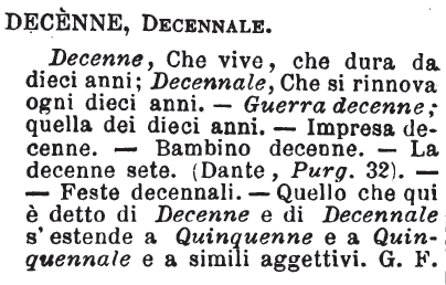 | Decenne, Decennale - Decenne, Che vive, che dura da dieci anni; Decennale, Che si rinnova ogni dieci anni. - Guerra decenne; quella dei dieci anni. - Impresa decenne. - Bambino decenne. - La decenne sete. (Dante, Purg. 32). - Feste decennali. - Quello che qui è detto di Decenne e di Decennale s'estende a Quinquenne e a Quinquennale e a simili aggettivi. G. F. [immagine] |