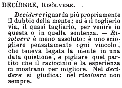 | Decidere, Risolvere - Decidere riguarda più propriamente il dubbio della mente; ed è il toglierlo via, il quasi tagliarlo, per venire in questa o in quella sentenza. - Risolvere è meno assoluto: è uno sciogliere pensatamente ogni vincolo, che teneva legata la mente in una data quistione, e pigliare quel partito che il raziocinio e la esperienza ci mostrano per migliore. Nel decidere si giudica: nel risolvere non sempre. [immagine] |