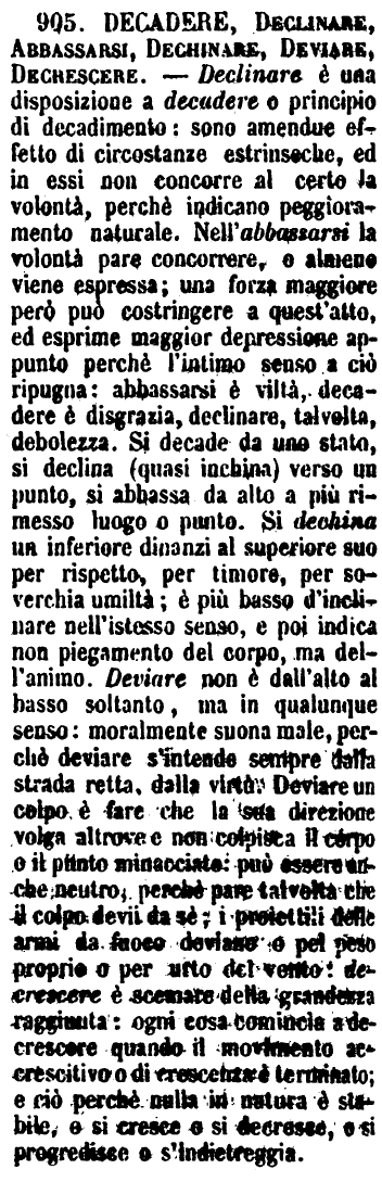 | Decadere, Declinare, Abbassarsi, Dechinare, Deviare, Decrescere - Declinare è una disposizione a decadere o principio di decadimento: sono amendue effetto di circostanze estrinseche, ed in essi non concorre al certo la volontà, perchè indicano peggioramento naturale. Nell'abbassarsi la volontà pare concorrere, o almeno viene espressa; una forza maggiore però può costringere a quest'atto, ed esprime maggior depressione appunto perchè l'intimo senso a ciò ripugna: abbassarsi è viltà, decadere è disgrazia, declinare, talvolta, debolezza. Si decade da uno stato, si declina (quasi inchina) verso un punto, si abbassa da alto a più rimesso luogo o punto. Si dechina un inferiore dinanzi al superiore suo per rispetto, per timore, per soverchia umiltà; è più basso d'inclinare nell'istesso senso, e poi indica non piegamento del corpo, ma dell'animo. Deviare non è dall'alto al basso soltanto, ma in qualunque senso: moralmente suona male, perchè deviare s'intende sempre dalla strada retta, dalla virtù. Deviare un colpo è fare che la sua direzione volga altrove e non colpisca il corpo o il punto minacciato: può essere anche neutro, perchè pare talvolta che il colpo devii da sè; i proiettili delle armi da fuoco deviano o pel peso proprio o per urto del vento: decrescere è scemare della grandezza raggiunta: ogni cosa comincia a decrescere quando il movimento accrescitivo o di crescenza è terminato; e ciò perchè nulla in natura è stabile, e si cresce e si decresce, e si progredisce e s'indietreggia. [immagine] |