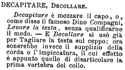 | Decapitare, Decollare - Decapitare è mozzare il capo, o, come disse il famoso Dino Compagni, Levare la testa, senza qualificarne il modo. - E Decollare si usò già per Tagliare la testa sul ceppo; ora sonerebbe invece il supplizio della corda o l'impiccatura, il cui effetto è appunto quello di disarticolare la prima vertebra del collo. [immagine] |