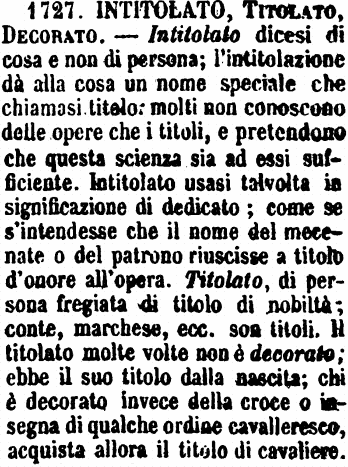 | Intitolato, Titolato, Decorato - Intitolato dicesi di cosa e non di persona; l'intitolazione dà alla cosa un nome speciale che chiamasi titolo: molti non conoscono delle opere che i titoli, e pretendono che questa scienza sia ad essi sufficiente. Intitolato usasi talvolta in significazione di dedicato; come se s'intendesse che il nome del mecenate o del patrono riuscisse a titolo d'onore all'opera. Titolato, di persona fregiata di titolo di nobiltà; conte, marchese, ecc. son titoli. Il titolato molte volte non è decorato; ebbe il suo titolo dalla nascita; chi è decorato invece della croce o insegna di qualche ordine cavalleresco, acquista allora il titolo di cavaliere. [immagine] |