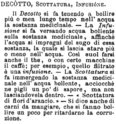 | Scottatura, Decotto - Sono due bevande calde fatte con erbe o sostanze medicinali. La prima si fa facendo passare l'acqua bollente sopra l'erba medicinale di cui si vuol che l'acqua pigli sapore. - «Scottatura di tiglio, di camomilla, ecc.» - La seconda, cioè il Decotto, si fa tenendo a bollire nell'acqua più o meno tempo l'erba o la sostanza medicinale. - «Decotto di china.» [immagine] |
