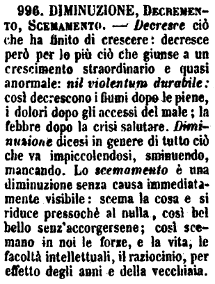 | Diminuzione, Decremento, Scemamento - Decresce ciò che ha finito di crescere: decresce però per lo più ciò che giunse a un crescimento straordinario e quasi anormale: nil violentum durabile: così decrescono i fiumi dopo le piene, i dolori dopo gli accessi del male; la febbre dopo la crisi salutare. Diminuzione dicesi in genere di tutto ciò che va impiccolendosi, sminuendo, mancando. Lo scemamento è una diminuzione senza causa immediatamente visibile: scema la cosa e si riduce pressochè al nulla, così bel bello senz'accorgersene; così scemano in noi le forze, e la vita, le facoltà intellettuali, il raziocinio, per effetto degli anni e della vecchiaia. [immagine] |