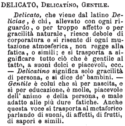 | Delicato, Delicatino, Gentile - Delicato, che viene dal latino Deliciae, è chi, allevato con ogni riguardo, o per troppo affetto o per gracilità naturale, riesce debole di corporatura e si risente di ogni mutazione atmosferica, non regge alla fatica, o simili; e si trasporta a significare tutto ciò che è gentile al tatto, a suoni dolci e piacevoli, ecc. - Delicatino significa solo gracilità di persona, e si dice de' bambini. - Gentile è colui che sì per nascita, e sì per educazione, è molle, piacevole dell'animo e della persona, e male adatto alle più dure fatiche. Anche questa voce si trasporta al metaforico parlando di suoni, di affetti, di frutti, di sapori e simili. [immagine] |
