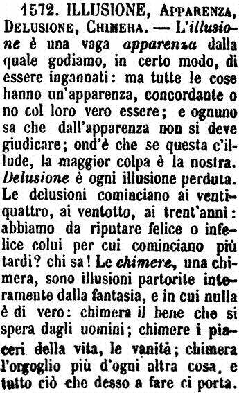 Illusione, Apparenza, Delusione, Chimera - L'illusione è una vaga apparenza dalla quale godiamo, in certo modo, di essere ingannati: ma tutte le cose hanno un'apparenza, concordante o no col loro vero essere; e ognuno sa che dall'apparenza non si deve giudicare; ond'è che se questa c'illude, la maggior colpa è la nostra. Delusione è ogni illusione perduta. Le delusioni cominciano ai ventiquattro, ai ventotto, ai trent'anni: abbiamo da riputare felice o infelice colui per cui cominciano più tardi? chi sa! Le chimere, una chimera, sono illusioni partorite interamente dalla fantasia, e in cui nulla è di vero: chimera il bene che si spera dagli uomini; chimere i piaceri della vita, le vanità; chimera l'orgoglio più d'ogni altra cosa, e tutto ciò che desso a fare ci porta. [immagine]
