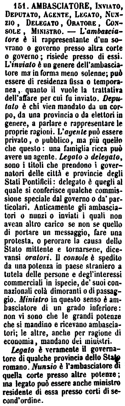 | Ambasciatore, Inviato, Deputato, Agente, Legato, Nunzio, Delegato, Oratore, Console, Ministro - L'ambasciatore è il rappresentante d'un sovrano o governo presso altra corte o governo; risiede presso di essi. L'inviato è un genere dell'ambasciatore ma in forma meno solenne; può essere di residenza fissa o temporanea, quanto il vuole la trattativa dell'affare per cui fu inviato. Deputato è chi vien mandato da un corpo, da una provincia o da elettori in genere, a parlare e rappresentare le proprie ragioni. L'agente può essere privato, o pubblico, ma più quello che questo: una famiglia ricca può avere un agente. Legato o delegato, sono i titoli che prendono i governatori delle città e provincie degli Stati Pontificii: delegato è quegli al quale si conferisce qualche commissione speciale dal governo o da' particolari. Anticamente gli ambasciatori o nunzi o inviati i quali non avean altro carico se non se quello di portare un messaggio, fare una protesta, o perorare la causa dello Stato mittente e tornarsene, dicevansi oratori. Il console è spedito da una potenza in paese straniero a tutela delle persone e degl'interessi commerciali in ispecie, de' suoi connazionali colà dimoranti o di passaggio. Ministro in questo senso è ambasciatore di un grado inferiore: non vi sono che le grandi potenze che si mandino e ricevano ambasciatori; le altre, anche per ragione di economia, mandano dei ministri.