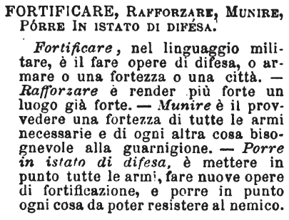 | Fortificare, Rafforzare, Munire, Porre in stato di difesa - Fortificare, nel linguaggio militare, è il fare opere di difesa, o armare o una fortezza o una città. - Rafforzare è render più forte un luogo già forte. - Munire è il provvedere una fortezza di tutte le armi necessarie e di ogni altra cosa bisognevole alla guarnigione. - Porre in istato di difesa, è mettere in punto tutte le armi, fare nuove opere di fortificazione, e porre in punto ogni cosa da poter resistere al nemico. [immagine] |
