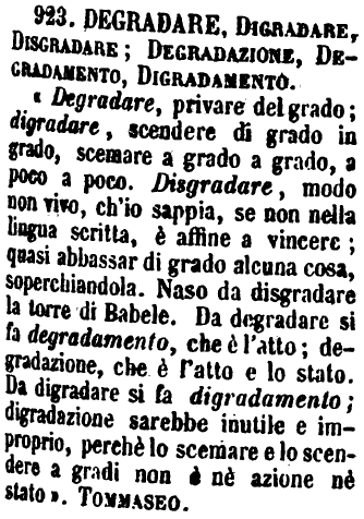 | Degradare, Digradare, Disgradare; Degradazione, Degradamento, Digradamento - «Degradare, privare del grado; digradare, scendere di grado in grado, scemare a grado a grado, a poco a poco. Disgradare, modo non vivo, ch'io sappia, se non nella lingua scritta, è affine a vincere; quasi abbassar di grado alcuna cosa, soperchiandola. Naso da disgradare la torre di Babele. Da degradare si fa degradamento, che è l'atto; degradazione, che è l'atto e lo stato. Da digradare si fa digradamento; digradazione sarebbe inutile e improprio, perchè lo scemare e lo scendere a gradi non è nè azione nè stato». Tommaseo. [immagine] |