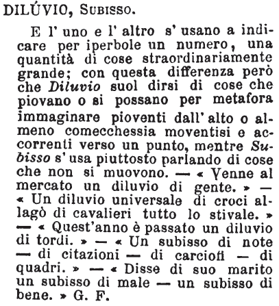| Diluvio, Subisso - E l'uno e l'altro s'usano a indicare per iperbole un numero, una quantità di cose straordinariamente grande; con questa differenza però che Diluvio suol dirsi di cose che piovano o si possano per metafora immaginare pioventi dall'alto o almeno comecchessia moventisi e accorrenti verso un punto, mentre Subisso s'usa piuttosto parlando di cose che non si muovono. - «Venne al mercato un diluvio di gente.» - «Un diluvio universale di croci allagò di cavalieri tutto lo stivale.» - «Quest'anno è passato un diluvio di tordi.» - «Un subisso di note - di citazioni - di carciofi - di quadri.» - «Disse di suo marito un subisso di male - un subisso di bene.» G. F. [immagine] |