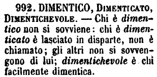 | Dimentico, Dimenticato, Dimentichevole - Chi è dimentico non si sovviene: chi è dimenticato è lasciato in disparte, non è chiamato; gli altri non si sovvengono di lui; dimentichevole è chi facilmente dimentica. [immagine] |