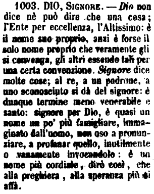 Dio, Signore - Dio non dice nè può dire che una cosa; l'Ente per eccellenza, l'Altissimo: è il nome suo proprio, anzi è forse il solo nome proprio che veramente gli si convenga, gli altri essendo tali per una certa convenzione. Signore dice molte cose; al re, a un padrone, a uno sconosciuto si dà del signore: è dunque termine meno venerabile e santo: signore per Dio, è quasi un nome un po' più famigliare, immaginato dall'uomo, non oso a pronunziare, a professar quello, inutilmente o vanamente invocandolo: è un nome più cordiale, dirò così, che alla preghiera, alla speranza più si affà. [immagine]