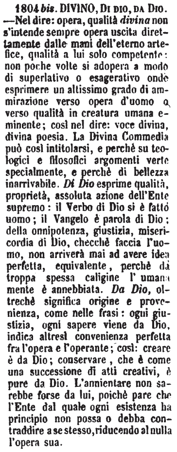 Divino, Di Dio, Da Dio - Nel dire: opera, qualità divina non s'intende sempre opera uscita direttamente dalle mani dell'eterno artefice, qualità a lui solo competente: non poche volte si adopera a modo di superlativo o esagerativo onde esprimere un altissimo grado di ammirazione verso opera d'uomo o verso qualità in creatura umana eminente; così nel dire: voce divina, divina poesia. La Divina Commedia può così intitolarsi, e perchè su teologici e filosofici argomenti verte specialmente, e perchè di bellezza inarrivabile. Di Dio esprime qualità, proprietà, assoluta azione dell'Ente supremo: il Verbo di Dio si è fatto uomo; il Vangelo è parola di Dio; della onnipotenza, giustizia, misericordia di Dio, checchè faccia l'uomo, non arriverà mai ad avere idea perfetta, equivalente, perchè da troppa spessa caligine l'umana mente è annebbiata. Da Dio, oltrechè significa origine e provenienza, come nelle frasi: ogni giustizia, ogni sapere viene da Dio, indica altresì convenienza perfetta fra l'opera e l'operante; così: creare è da Dio; conservare, che è come una successione di atti creativi, è pure da Dio. L'annientare non sarebbe forse da lui, poichè pare che l'Ente dal quale ogni esistenza ha principio non possa o debba contraddire a se stesso, riducendo al nulla l'opera sua. [immagine]