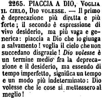 Piaccia a Dio, Voglia il cielo, Dio volesse - Il primo è deprecazione più diretta e più forte; il secondo è espressione di vivo desiderio, ma più vaga e generica: piaccia a Dio che io giunga a salvamento! voglia il cielo che non succedano disgrazie! Dio volesse è un termine medio fra la deprecazione e il desiderio, ma essendo di tempo imperfetto, significa un tempo e un modo più indeterminato: Dio volesse che le cose si mettessero al meglio! [immagine]