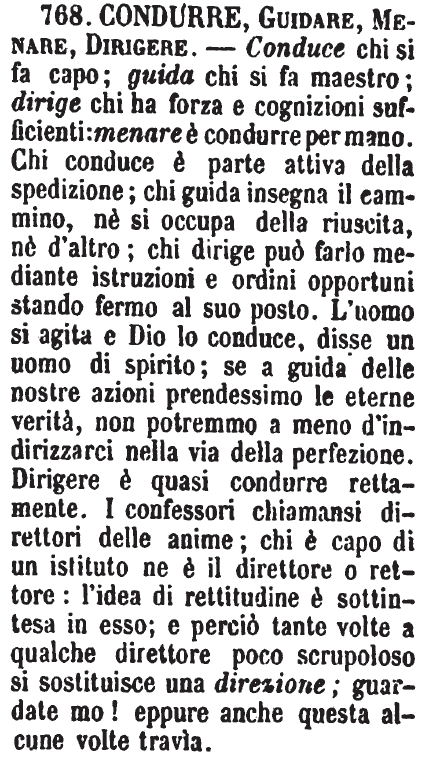 | Condurre, Guidare, Menare, Dirigere - Conduce chi si fa capo; guida chi si fa maestro; dirige chi ha forza e cognizioni sufficienti: menare è condurre per mano. Chi conduce è parte attiva della spedizione; chi guida insegna il cammino, nè si occupa della riuscita, nè d'altro; chi dirige può farlo mediante istruzioni e ordini opportuni stando fermo al suo posto. L'uomo si agita e Dio lo conduce, disse un uomo di spirito; se a guida delle nostre azioni prendessimo le eterne verità, non potremmo a meno d'indirizzarci nella via della perfezione. Dirigere è quasi condurre rettamente. I confessori chiamansi direttori delle anime; chi è capo di un istituto ne è il direttore o rettore: l'idea di rettitudine è sottintesa in esso; e perciò tante volte a qualche direttore poco scrupoloso si sostituisce una direzione; guardate mo! eppure anche questa alcune volte travìa. [immagine] |