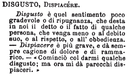 | Disgusto, Dispiacere - Disgusto è quel sentimento poco gradevole o di ripugnanza, che desta in noi il detto o il fatto di qualche persona, che venga meno o al debito suo, o al rispetto, o all'obbedienza.- Dispiacere è più grave, e dà sempre cagione di dolore e di rammarico. -" Cominciò col darmi qualche disgusto; ma ora mi dà parecchi dispiaceri. " [immagine] |