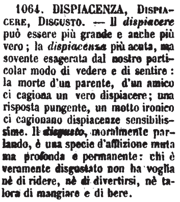 | Dispiacenza, Dispiacere, Disgusto - Il dispiacere può essere più grande e anche più vero; la dispiacenza più acuta, ma sovente esagerata dal nostro particolar modo di vedere e di sentire: la morte d'un parente, d'un amico ci cagiona un vero dispiacere; una risposta pungente, un motto ironico ci cagionano dispiacenze sensibilissime. Il disgusto, moralmente parlando, è una specie d'afflizione muta ma profonda e permanente: chi è veramente disgustato non ha voglia nè di ridere, nè di divertirsi, nè talora di mangiare e di bere. [immagine] |