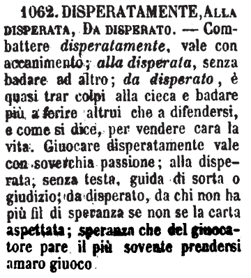 | Disperatamente, Alla disperata, Da disperato - Combattere disperatamente, vale con accanimento; alla disperata, senza badare ad altro; da disperato, è quasi trar colpi alla cieca e badare più a ferire altrui che a difendersi, e come si dice, per vendere cara la vita. Giuocare disperatamente vale con soverchia passione; alla disperata, senza testa, guida di sorta o giudizio; da disperato, da chi non ha più fil di speranza se non se la carta aspettata; speranza che del giuocatore pare il più sovente prendersi amaro giuoco. [immagine] |
