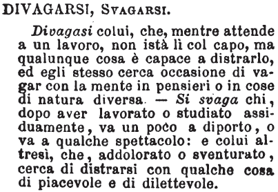| Divagarsi, Svagarsi - Divagasi colui, che, mentre attende a un lavoro, non istà lì col capo, ma qualunque cosa è capace a distrarlo, ed egli stesso cerca occasione di vagar con la mente in pensieri o in cose di natura diversa. - Si svaga chi, dopo aver lavorato o studiato assiduamente, va un poco a diporto, o va a qualche spettacolo: e colui altresì, che, addolorato o sventurato, cerca di distrarsi con qualche cosa di piacevole e di dilettevole. [immagine] |