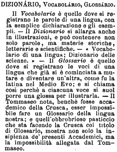 | Dizionario, Vocabolario, Glossario - Il Vocabolario è quello dove si registrano le parole di una lingua, con la semplice dichiarazione e gli esempii. - Il Dizionario si allarga anche in illustrazioni, e può contenere non solo parole, ma materie storiche, letterarie e scientifiche. - « Vocabolario di una lingua; Dizionario delle scienze. » Il Glossario è quello dove si registrano le voci di una lingua che già si è cominciata a mutare e diventare un'altra, come fu la latina nel Medio Evo; e si chiama così perchè a ciascuna voce si suol porre una glossa per illustrarla. - Il Tommaseo nota, benchè fosse accademico della Crusca, esser impossibile fare un Glossario della lingua nostra; e quell'obbrobrioso pasticcio che sta facendo la Crusca col titolo di Glossario, mostra non solo la insipienza de' presenti Accademici, ma la impossibilità allegata dal Tommaseo. [immagine] |