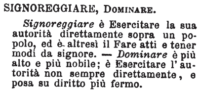 | Signoreggiare, Dominare - Signoreggiare è Esercitare la sua autorità direttamente sopra un popolo, ed è altresì il Fare atti e tener modi da signore. - Dominare è più alto e più nobile; è Esercitare l'autorità non sempre direttamente, e posa su diritto più fermo. [immagine] |