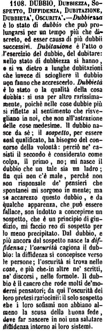 | Dubbio, Dubbiezza, Sospetto - Il Dubbio è la sospensione e incertezza della mente intorno a cosa, la cui verità non è in tutto chiara. - Dubbiezza è il sentimento del dubbio prolungato; lo stato di chi è in dubbio; la qualità estrinseca del dubbio. - «La sua dubbiezza rovina tutte le imprese. - C'è tuttora molta dubbiezza in questa dottrina.» Il Sospetto è opinione dubbia o probabile di futuro danno. - «Vivo in continuo sospetto.» - Ed è anche di cosa passata; ma allora riguarda solo alla opinione senza rispetto a danno. - «Si ha sospetto che quella falsificazione la facesse lui.» [immagine] |