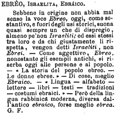 | Ebreo, Israelita, Ebraico - Sebbene in origine non abbia mal senso la voce Ebreo, oggi, come sostantivo, e fuori degli usi storici, suona quasi sempre un che di dispregio, almeno pe’ non Israeliti; ed essi stessi tra loro e da chi giustamente li rispetta, vengon detti Israeliti, non Ebrei. – Come aggettivo, Ebreo, nonostante gli esempii antichi, si riserba oggi alle persone e al popolo. - «La storia del popolo ebreo. – Le donne ebree.» - Di cose, meglio Ebraico. - «Lingua – alfabeto – lettere – libri – testi – tradizioni – costumi ebraici.» - Però della lingua rabbinica moderna, diversa dall’antico ebraico, forse meglio ebrea. G. F. [immagine] |