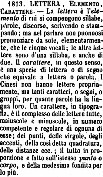 | Lettera, Elemento, Carattere - La lettera è l'elemento di cui si compongono sillabe, parole, discorso, scrivendo e stampando; ma nel parlare non puonnosi pronunziare da sole, elementarmente, che le cinque vocali; le altre lettere sono d'una sillaba, e anche di due. Il carattere, in questo senso, è una specie di lettera o di segno che equivale a lettera o parola. I Cinesi non hanno lettere propriamente, ma tanti caratteri, o segni, o gruppi, per quante parole ha la lingua loro. Un carattere, in tipografia, è il complesso delle lettere tutte, maiuscole e minuscole, in numero competente e regolare di ognuna di esse; dei punti, delle virgole, degli accenti, della così detta quadratura, delle distanze ecc.; il tutto in proporzione e fatto sull'istesso punto o corpo, e della medesima fondita per la più. [immagine] |