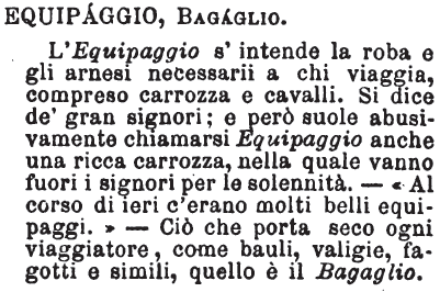 | Equipaggio, Bagaglio - L'Equipaggio s'intende la roba e gli arnesi necessarii a chi viaggia, compreso carrozza e cavalli. Si dice de' gran signori; e però suole abusivamente chiamarsi Equipaggio anche una ricca carrozza, nella quale vanno fuori i signori per le solennità. - «Al corso di ieri c'erano molti belli equipaggi.» - Ciò che porta seco ogni viaggiatore, come bauli, valige, fagotti e simili, quello è il Bagaglio. [immagine] |