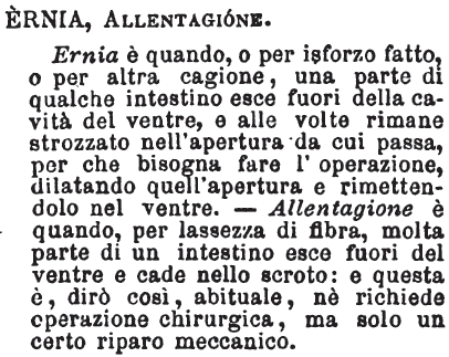 | Ernia, Allentagione - Ernia è quando, o per isforzo fatto, o per altra cagione, una parte di qualche intestino esce fuori della cavità del ventre, e alle volte rimane strozzato nell'apertura da cui passa, per che bisogna fare l'operazione, dilatando quell'apertura e rimettendolo nel ventre. - Allentagione è quando, per lassezza di fibra, molta parte di un intestino esce fuori del ventre e cade nello scroto: e questa è, dirò così, abituale, nè richiede operazione chirurgica, ma solo un certo riparo meccanico. [immagine] |