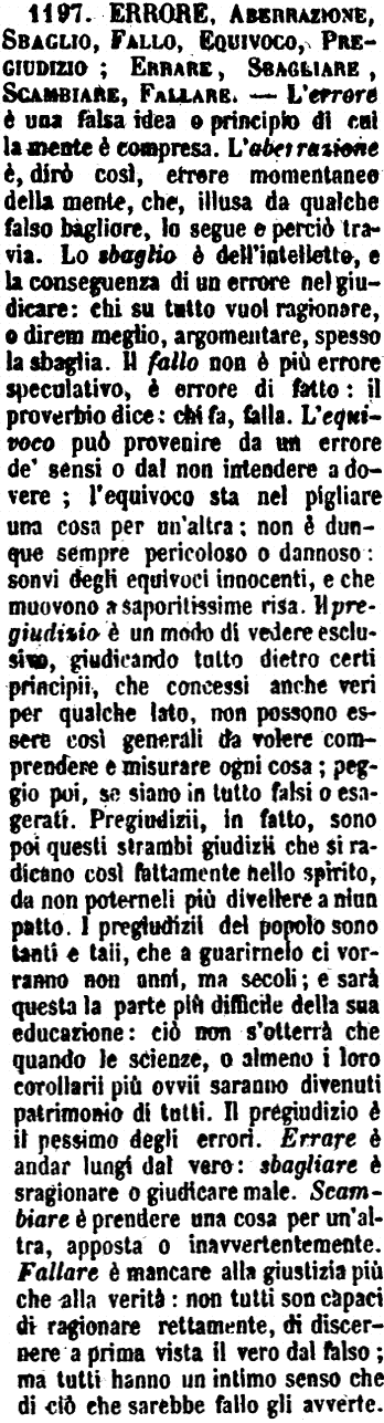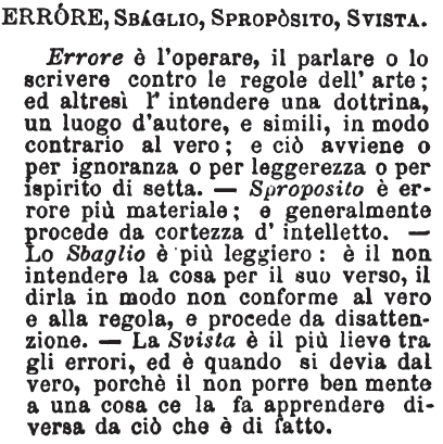 | Errore, Sbaglio, Sproposito, Svista - Errore è l'operare, il parlare o lo scrivere contro le regole dell'arte; ed altresì l'intendere una dottrina, un luogo d'autore, e simili, in modo contrario al vero; e ciò avviene o per ignoranza o per leggerezza o per ispirito di setta. - Sproposito è errore più materiale; e generalmente procede da cortezza d'intelletto. - Lo Sbaglio è più leggiero: è il non intendere la cosa per il suo verso, il dirla in modo non conforme al vero e alla regola, e procede da disattenzione. - La Svista è il più lieve tra gli errori, ed è quando si devia dal vero, porchè il non porre ben mente a una cosa ce la fa apprendere diversa da ciò che è di fatto. [immagine] |