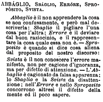 | Abbaglio, Sbaglio, Errore, Sproposito, Svista - Abbaglio è il non apprendere la cosa se non confusamente, e però mal descriverla: Sbaglio il pigliare l'una cosa per l'altra; Errore è il deviare dal buon raziocinio, e il rappresentare la cosa quale essa non è. - Sproposito è quando si dice cosa aliena dal proposito del nostro discorso; Svista è il non conoscere l'errore manifesto, non per cagione d'ignoranza, ma per difetto di attenzione. - L'Abbaglio è cagionato da falsa apparenza; lo Sbaglio e la Svista da disattenzione; nell'Errore e nello Sproposito concorrono altresì il difetto della mente ed il poco sapere. [immagine] |
