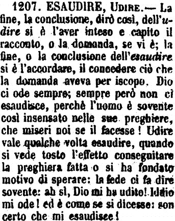 | Esaudire, Udire - La fine, la conclusione, dirò così, dell'udire si è l'aver inteso e capito il racconto, o la domanda, se vi è; la fine, o la conclusione dell'esaudire si è l'accordare, il concedere ciò che la domanda aveva per iscopo. Dio ci ode sempre; sempre però non ci esaudisce, perchè l'uomo è sovente così insensato nelle sue preghiere, che miseri noi se il facesse! Udire vale qualche volta esaudire, quando si vede tosto l'effetto conseguitare la preghiera fatta o si ha fondato motivo di sperare: la fede ci fa dire sovente: ah sì, Dio mi ha udito! Iddio mi ode! ed è come se si dicesse: son certo che mi esaudisce! [immagine] |