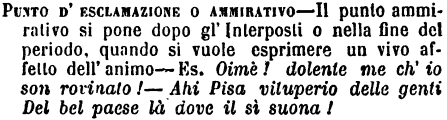 | Punto d’esclamazione o ammirativo - Il punto ammirativo si pone dopo gl'Interposti o nella fine del periodo, quando si vuole esprimere un vivo affetto dell'animo - Es. Oimè! dolente me ch'io son rovinato! - Ahi Pisa vituperio delle genti Del bel paese là dove il sì suona! [immagine] |