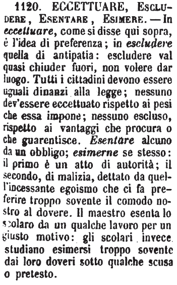 | Eccettuare, Escludere, Esentare, Esimere - In Eccettuare, come si disse qui sopra, è l'idea di preferenza; in Escludere quella di antipatia: Escludere val quasi Chiuder fuori, Non volere dar luogo. Tutti i cittadini devono essere uguali dinanzi alla legge; nessuno dev'essere eccettuato, rispetto ai pesi che essa impone, nessuno escluso, rispetto ai vantaggi che procura o che guarentisce. - Esentare alcuno da un obbligo. - Esimere sè stesso. Il primo è un atto di autorità; il secondo, di malizia, dettato da quell'incessante egoismo che ci fa preferire troppo sovente il comodo nostro al dovere. Il maestro esenta lo scolaro da un qualche lavoro per un giusto motivo: gli scolari invece studiano di esimersi troppo sovente dai loro doveri sotto qualche scusa o pretesto. (Zecchini). [immagine] |