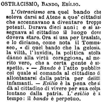 Ostracismo, Bando, Esilio - L'Ostracismo era quel bando che soleva darsi ad Atene a que' cittadini che accennavano a diventare troppo potenti. Durava dieci anni: e si assegnava al cittadino il luogo dove doveva stare. Ora si usa per traslato, e lo diciamo, come nota il Tommaseo, «di quel bando che la gelosia, la viltà, l'invidia, la politica stolta dánno alla virtù coraggiosa, al merito vero, che a certa gente è sospetto.» - Bando è l'atto pubblico col quale si comanda al cittadino di allontanarsi dalla patria per delitti infamanti. - Esilio è la pena che si dà al cittadino di vivere per sua colpa lontano dalla patria. L'esilio è a tempo: il bando è perpetuo. [immagine]