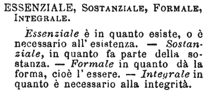 | Essenziale, Sostanziale, Formale, Integrale - Essenziale è in quanto esiste, o è necessario all'esistenza. - Sostanziale, in quanto fa parte della sostanza. - Formale in quanto dà la forma, cioè l'essere. - Integrale in quanto è necessario alla integrità. [immagine] |