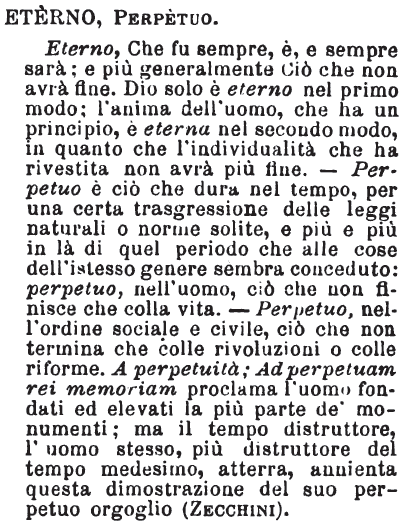 | Eterno, Perpetuo - Eterno, Che fu sempre, è, e sempre sarà; e più generalmente Ciò che non avrà fine. Dio solo è eterno nel primo modo; l'anima dell'uomo, che ha un principio, è eterna nel secondo modo, in quanto che l'individualità che ha rivestita non avrà più fine. - Perpetuo è ciò che dura nel tempo, per una certa trasgressione delle leggi naturali o norme solite, e più e più in là di quel periodo che alle cose dell'istesso genere sembra conceduto: perpetuo, nell'uomo, ciò che non finisce che colla vita. - Perpetuo, nell'ordine sociale e civile, ciò che non termina che colle rivoluzioni o colle riforme. A perpetuità; Ad perpetuam rei memoriam proclama l'uomo fondati ed elevati la più parte de' monumenti; ma il tempo distruttore, l'uomo stesso, più distruttore del tempo medesimo, atterra, annienta questa dimostrazione del suo perpetuo orgoglio. (Zecchini). [immagine] |