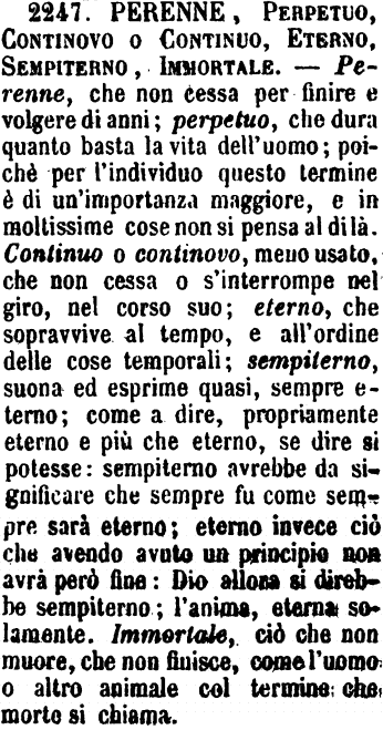 | Perenne, Perpetuo, Continovo o Continuo, Eterno, Sempiterno, Immortale - Perenne, che non cessa per finire e volgere di anni; perpetuo, che dura quanto basta la vita dell'uomo; poichè per l'individuo questo termine è di un'importanza maggiore, e in moltissime cose non si pensa al di là. Continuo o continovo, meno usato, che non cessa o s'interrompe nel giro, nel corso suo; eterno, che sopravvive al tempo, e all'ordine delle cose temporali; sempiterno, suona ed esprime quasi, sempre eterno; come a dire, propriamente eterno e più che eterno, se dire si potesse: sempiterno avrebbe da significare che sempre fu come sempre sarà eterno; eterno invece ciò che avendo avuto un principio non avrà però fine: Dio allora si direbbe sempiterno; l'anima, eterna solamente. Immortale, ciò che non muore, che non finisce, come l'uomo o altro animale col termine che morte si chiama. [immagine] |