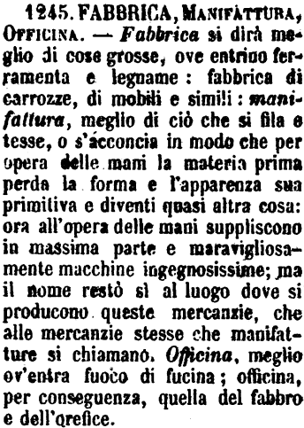 | Officina, Fabbrica, Opificio, Fucina - Officina è quella dove si costruiscono macchine e ordigni, e ogni altra cosa che si faccia per via di scienza meccanica. - Fabbrica è quella dove si lavora ogni sorta di masserizie, di telaggi, e altre cose di usi domestici: e se ne abusa tanto, che si arriva fino a dire Fabbrica di pane e paste. - L'Opificio è fabbrica più in grande, dove lavorano molti operai; e s'intende più specialmente di grandi fabbriche di panni, di macchine e simili. - [Fucina è propriamente quella de' fabbri o dei magnani. G. F.] [immagine] |