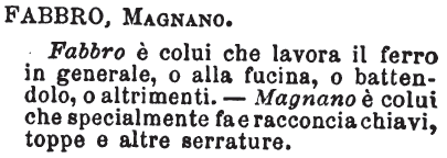 | Fabbro, Magnano - Fabbro è colui che lavora il ferro in generale, o alla fucina, o battendolo, o altrimenti. - Magnano è colui che specialmente fa e racconcia chiavi, toppe e altre serrature. [immagine] |