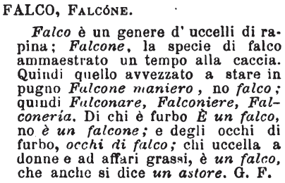 | Falco, Falcone - Falco è un genere d'uccelli di rapina; Falcone, la specie di falco ammaestrato un tempo alla caccia. Quindi quello avvezzato a stare in pugno Falcone maniero, no falco; quindi Falconare, Falconiere, Falconeria. Di chi è furbo E' un falco, no è un falcone; e degli occhi di furbo, occhi di falco; chi uccella a donne e ad affari grassi, è un falco, che anche si dice un astore. G. F. [immagine] |