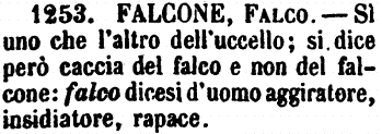 | Falcone, Falco - Sì uno che l'altro dell'uccello; si dice però caccia del falco e non del falcone: falco dicesi d'uomo aggiratore, insidiatore, rapace. [immagine] |